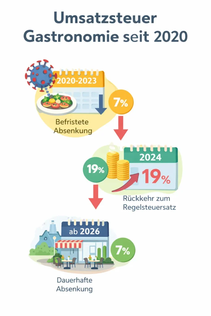 Ab dem 1. Januar 2026 wird die Umsatzsteuer auf Speisen im Rahmen von Restaurant- und Verpflegungsdienstleistungen dauerhaft auf 7 % abgesenkt. Getränke bleiben weiterhin beim regulären Steuersatz von 19 %.
